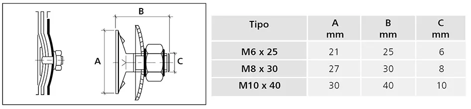 Detalle del tornillo de acero galvanizado con tetones de fijación a la cinta, provistos de tuerca y arandela abombada.