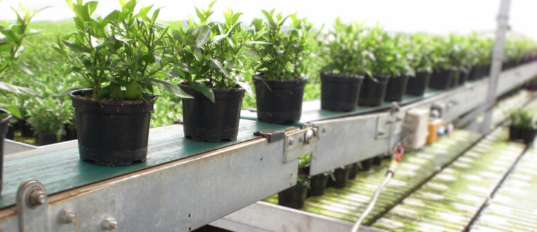 Los invernaderos están divididos en varios secciones y miles de macetas están transportadas cada hora.