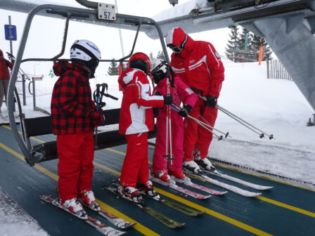 En las estaciones de esquí, la banda transportadora con carriles ayuda a posicionar ordenadamente y en movimiento a los esquiadores para embarcar y desembarcar los telesillas.